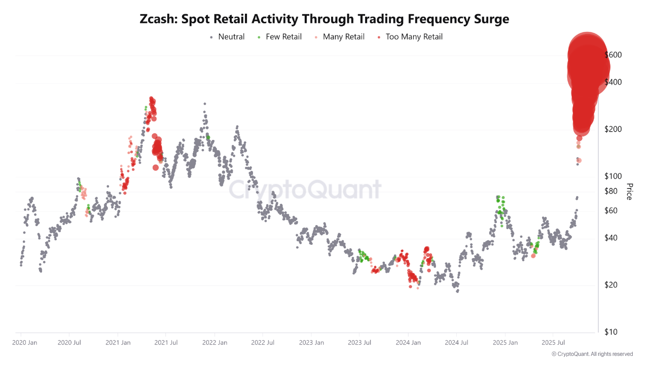 Furthermore, CryptoOnchain highlights that the final phase of the ZEC rally is now dominated by retail. The “Too Many Retail” signal on the Spot Retail Activity metric is flashing red, a classic sign that usually appears when the market is at its peak.