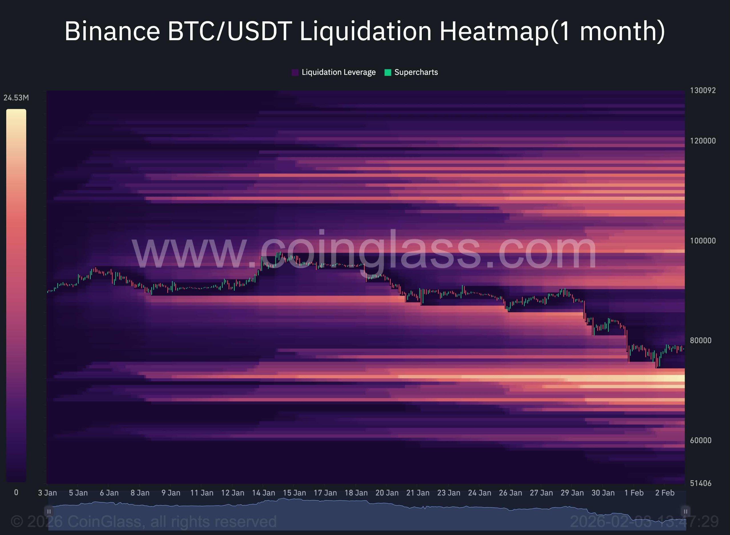 Although the recent decline has already triggered a long liquidation cascade, the heatmap suggests that downside liquidity has not yet been fully cleared. After a brief thinning of liquidity below current price levels, leverage builds significantly closer to $70K, increasing the probability of a deeper sweep in the mid-term. Should price remain weak and fail to reclaim higher liquidity zones above, this lower cluster may ultimately act as an absorption area, where sell-side pressure is met by stronger bid interest, potentially stabilizing price following the drawdown.