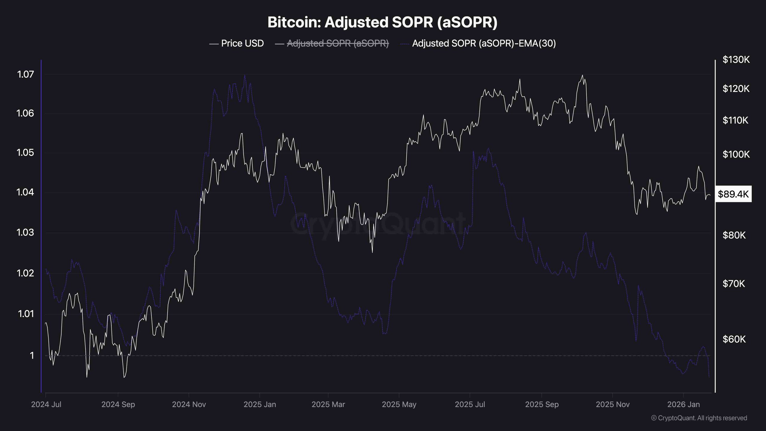 If aSOPR stabilizes around 1 while price holds higher-timeframe support, it would suggest a healthier, more balanced market that is flushing out marginal sellers without broad capitulation; a sustained drop of the 30-day exponential moving average of the aSOPR below 1, by contrast, would point to a deeper profit-taking and loss-realization regime consistent with a more extended corrective phase.