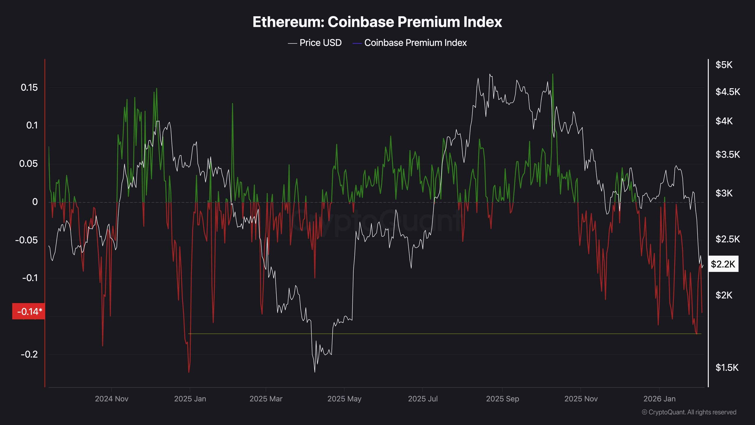 The Ethereum Coinbase Premium Index is currently deeply negative and has dropped to levels last seen around the previous year’s major market lows, signalling a clear bearish state in market sentiment. This persistent negative premium reflects sustained selling pressure from US-based investors, with Ethereum trading at a discount on Coinbase relative to offshore exchanges.